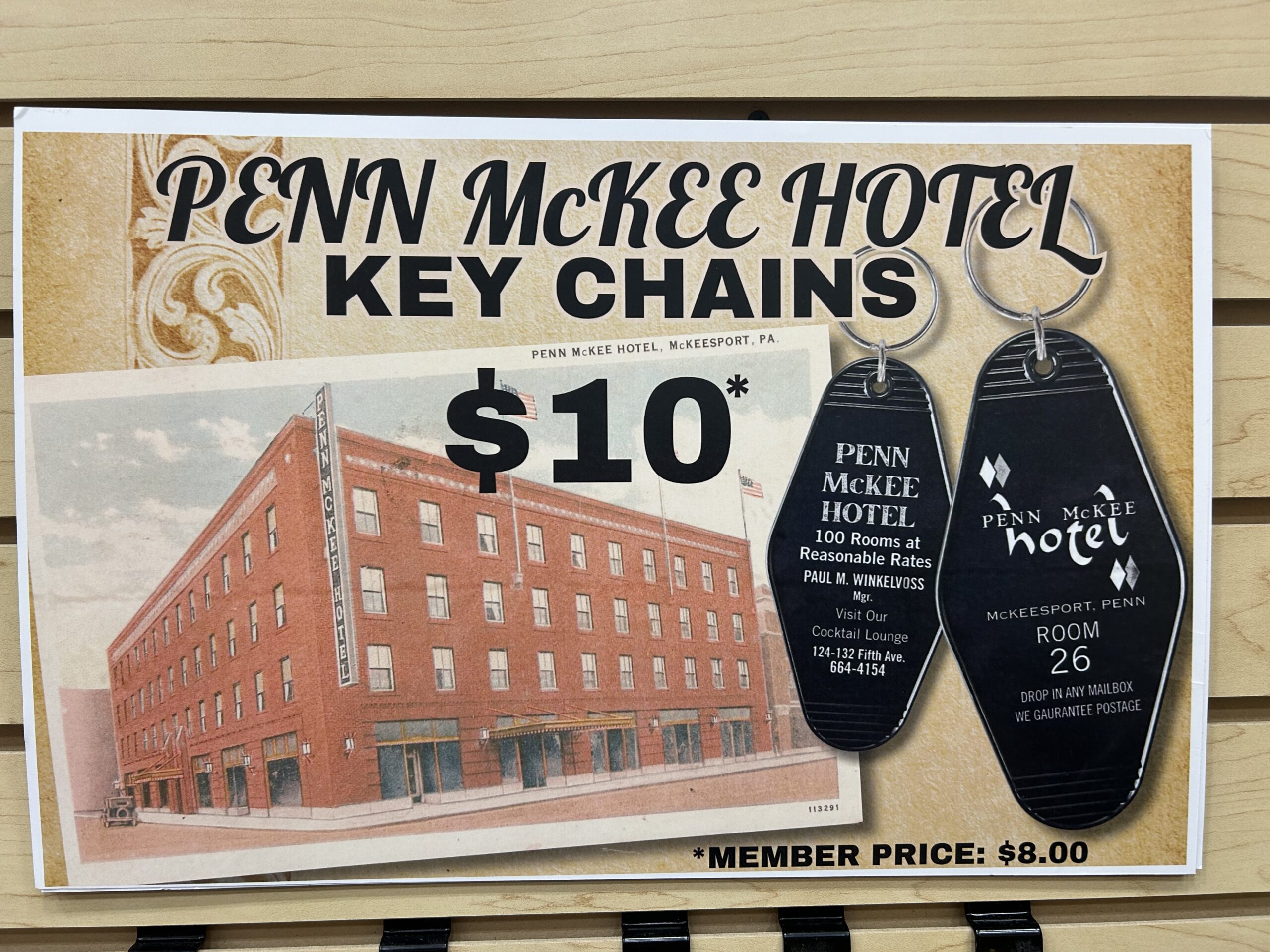 Key chains in the style of hotel room keys from the old Penn McKee Hotel
